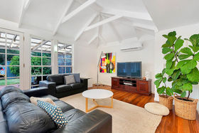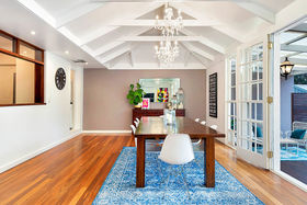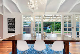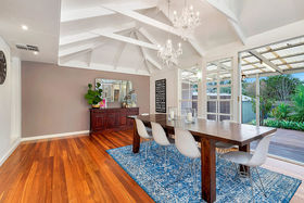The large family room is at the rear of the home. This beautiful area of the home features glistening chandeliers hanging from the jaw-dropping high-pitched roof, over the dining table and a pair of classy french doors. A lounge area is set at the far side of the room and is directly under the brand new split system air-conditioning.