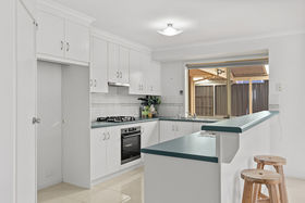 At the heart of the home, the lounge flows seamlessly through to the dining area and into a generous family room, creating a spacious environment for both relaxation and everyday activity. The centrally positioned kitchen provides excellent bench space, overhead cabinetry and convenient visibility across the living areas, ensuring effortless connection between cooking, dining and family time.